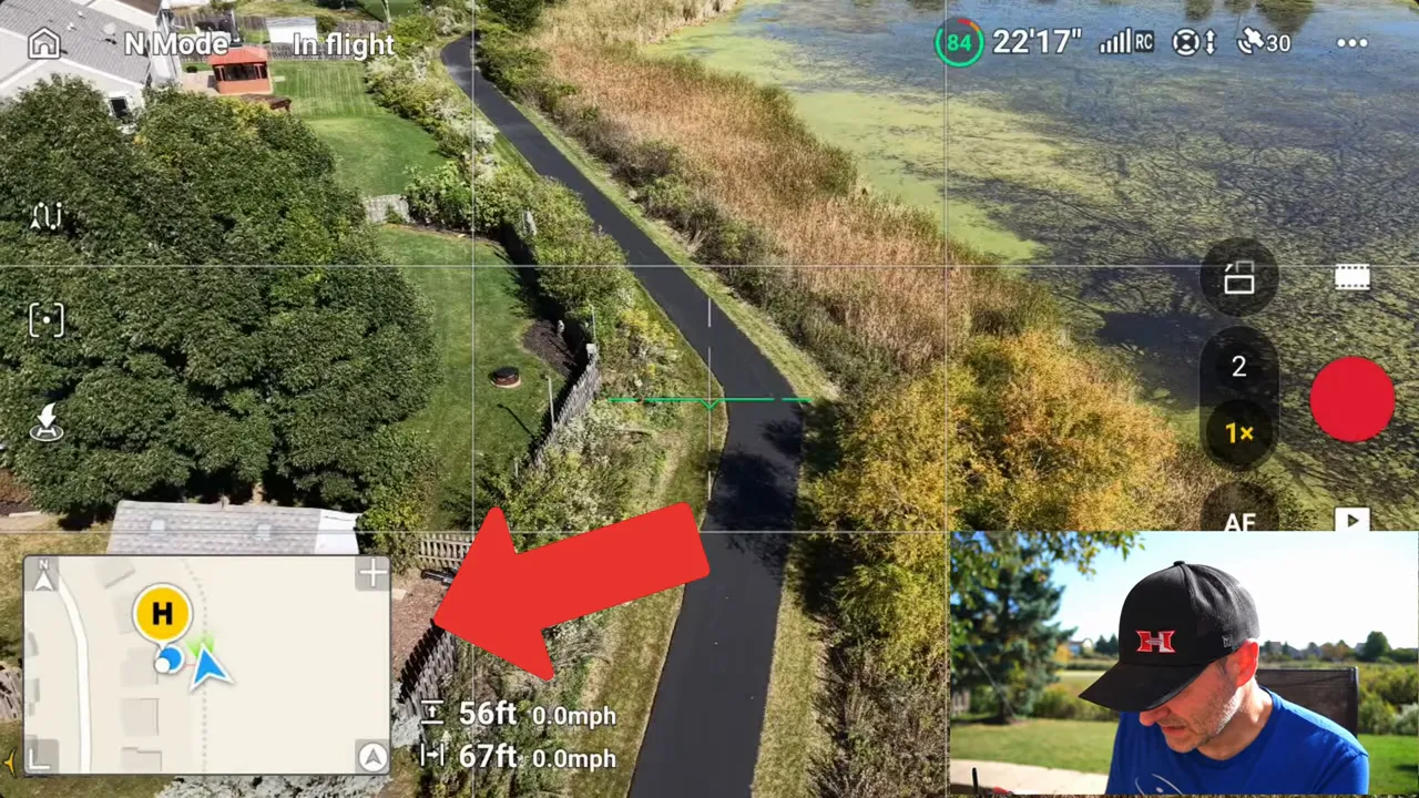 • Mapa/compás (esquina inferior izquierda): Mini mapa interactivo que puedes hacer más pequeño o convertir en compás. Al tocar los bordes puedes alternar entre vistas de las cámaras de evitación de obstáculos (lateral, posterior, inferior), útil para comprobar el entorno sin mover el Drone.